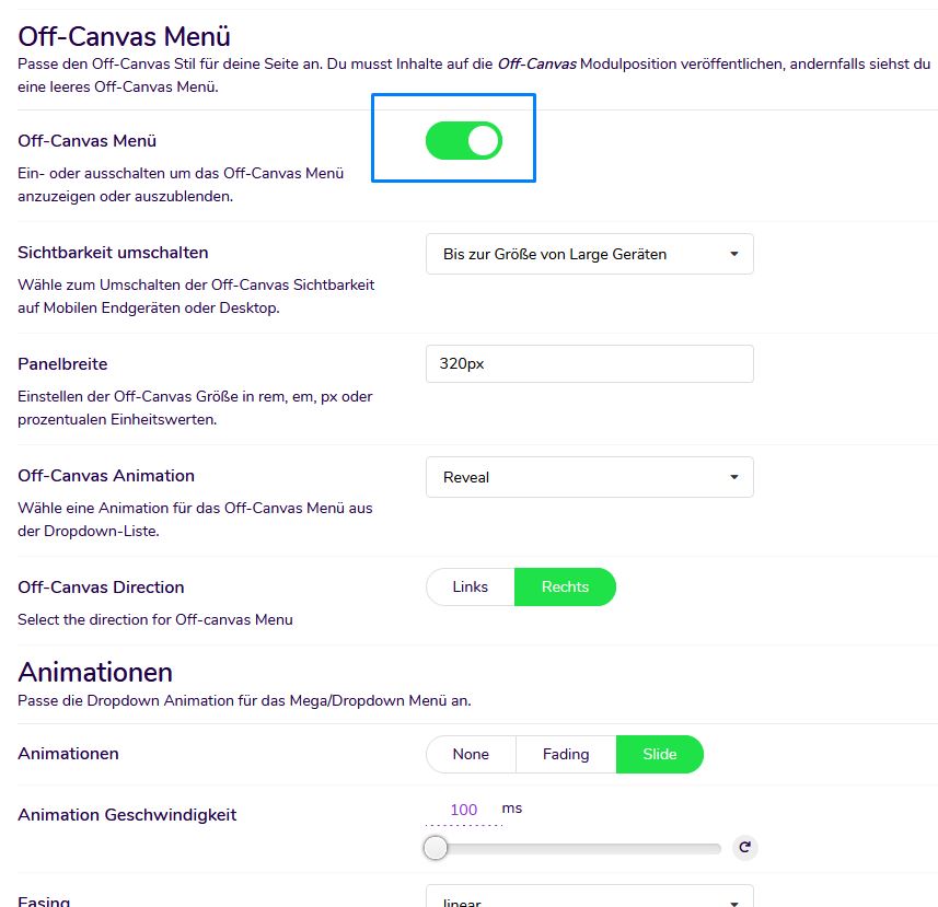 Das Theme wird auch mit dem Off Canvas-Menü geliefert. Sie können es neben Ihrem regulären Menü verwenden und jedes Modul an der Position außerhalb der Leinwand veröffentlichen.