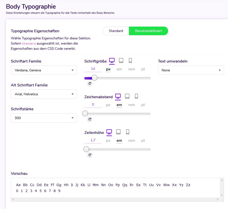 Spielen Sie mit der Schriftfamilie, Größe, Transformation, Stil, Dekoration, Zeilenhöhe und Buchstabenabstand, um den Benutzern auf Ihrer Website ein anderes Erscheinungsbild zu verleihen.